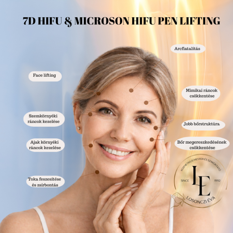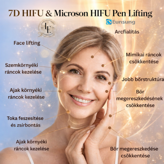 A 7D HIFU kezelések műtét nélküli lifting technológiával feszesítik a bőrt és javítják az arckontúrokat nagyobb területeken is, mélyebb szöveti szinteken hatva.